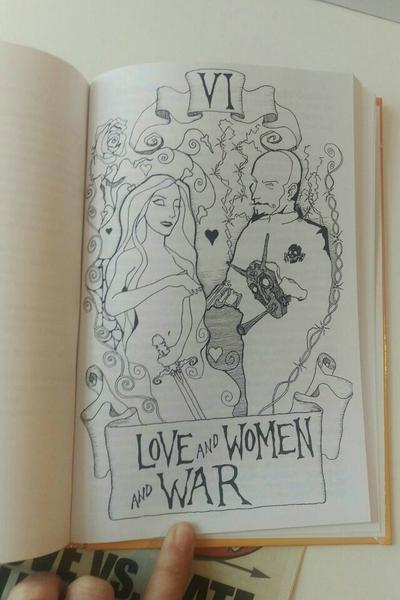 Art by "Doug Mesner" for 2003 edition of Might Is Right. Drawing for the start of part VI, "Love and Women and War". Two people, looks like a stereotypically heterosexual couple with a naked, pregnant(? - at least the posture) long-haired woman holding a sword standing next to a man with a shaved head, mustache and chin beard, holding a revolver in one hand and a wodden devil mask with a trumpet extending from the lips. The background is a melding of barbwire pattern and a rose?
