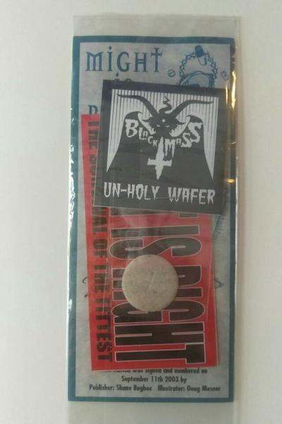 Package to accompany 2003 edition of Might Is Right. Appears to be various stickers and such, saying "Might Is Right" and "Survival of the Fittest". Partially obscured, the bottom says that this book was signed and numbered on Sept. 11, 2003, with Publisher Shane Bugbee and Illustrator Doug Mesner.
