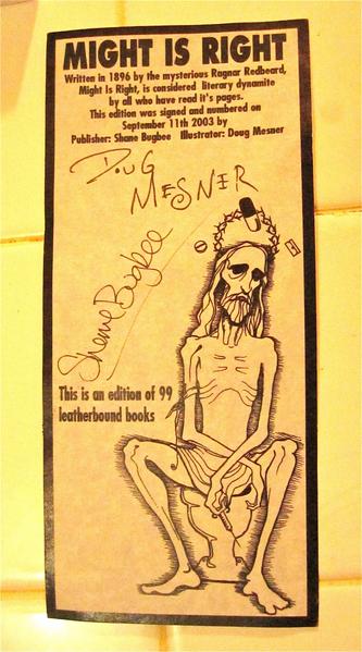 Poster for Might Is Right with illustration by Doug Mesner of an emaciated Jesus figure with a crown of thorns sitting on a toilet with his arm tied off and a needle in his hand while pills and a razor hovers over his head. On the side it, "This is an edition of 99 leatherbound books." At top: "Might Is Right - Written in 1896 by the mysterious Ragnar Redbeard, Might Is Right is considered literary dynamite by all who have read it's pages. The edition was signed and numbered on September 11, 2003, by Publisher: Shane Bugbee, Illustrator: Doug Mesner.