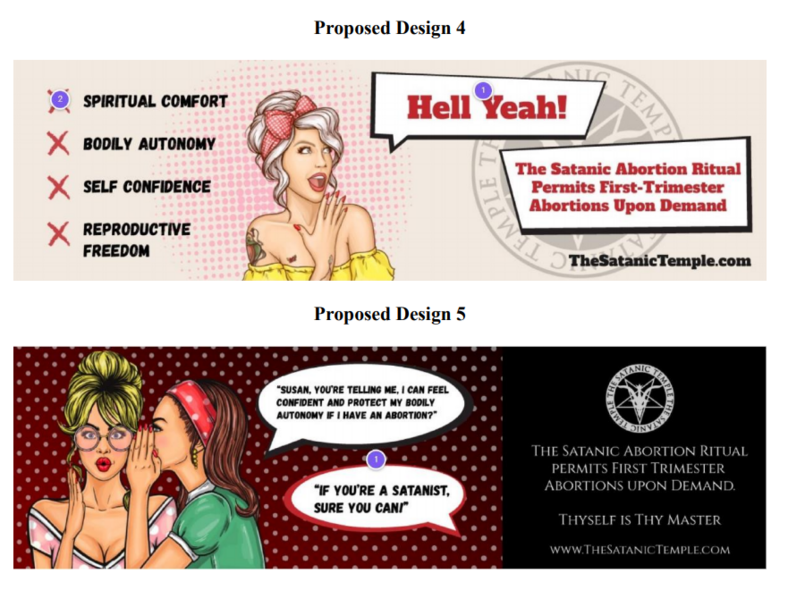 Two proposed designs rejected by Lamar Advertising, leading to the lawsuit The Satanic Temple, Inc. v. Lamar Advertising of Louisiana, LLC